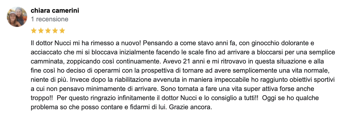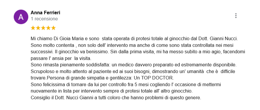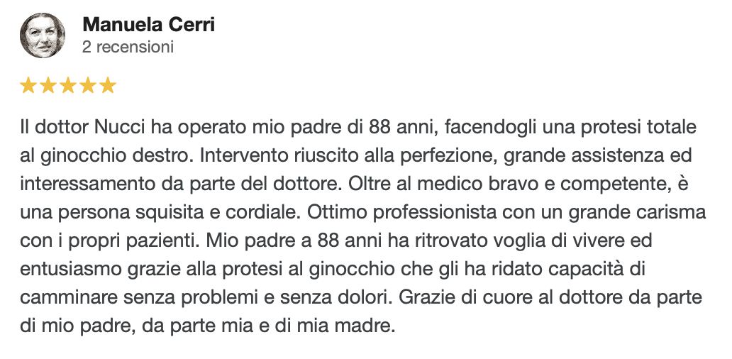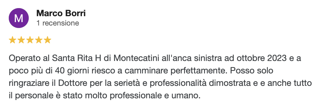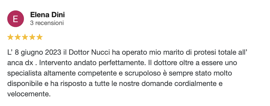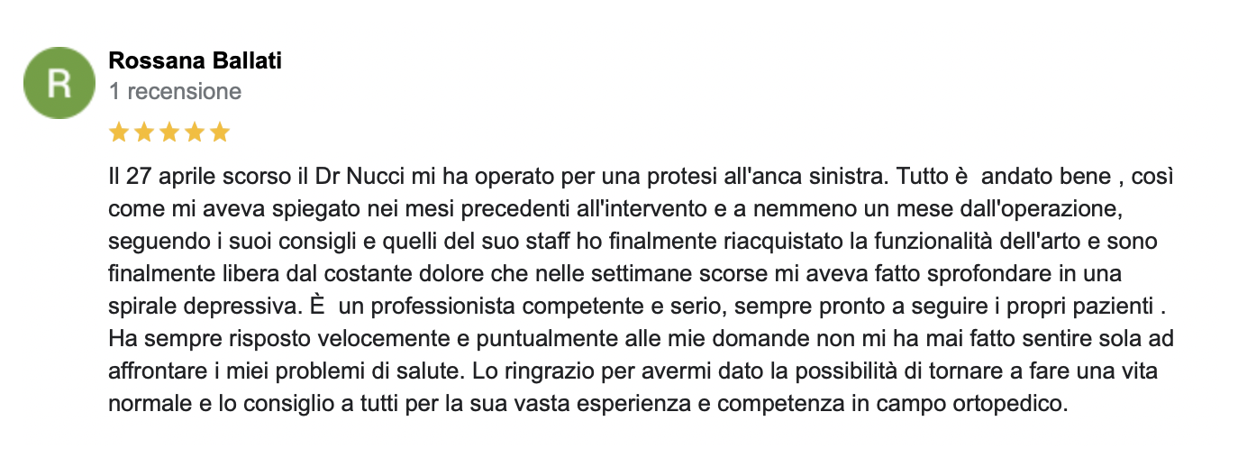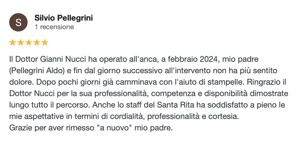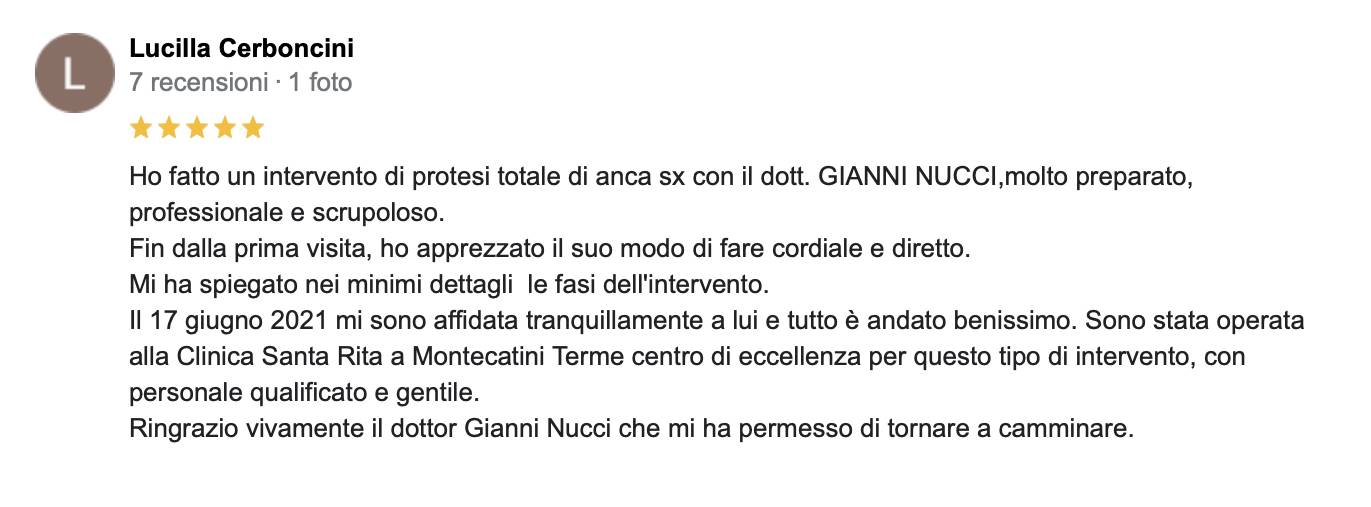 Mi presento: sono il Dott. Nucci, responsabile ortopedico in una clinica solo ortopedica, il Santa Rita Hospital a Montecatini Terme, che effettua più di mille protesi all’anno e che non accoglie urgenze o pazienti con altre patologie, quindi organizzata ed incentrata sul trattamento ortopedico (niente pronto soccorso con possibilità di entrate incontrollate, urgenze che rivoluzionano le liste; personale formato e specializzato in ortopedia).